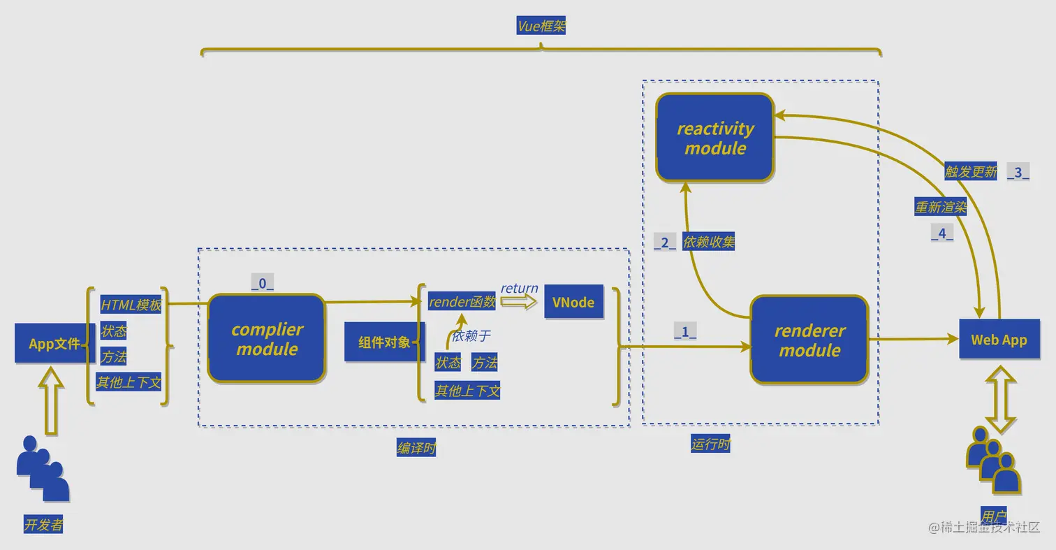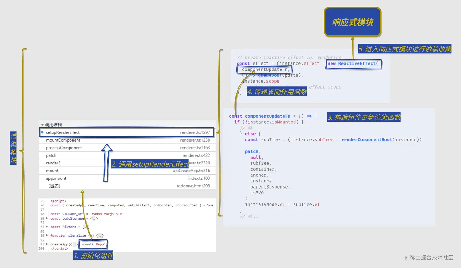 接下来主要结合渲染模块谈谈框架是如何让一个组件进入响应式模块的,简单来说就是初始化过程是如何工作的: