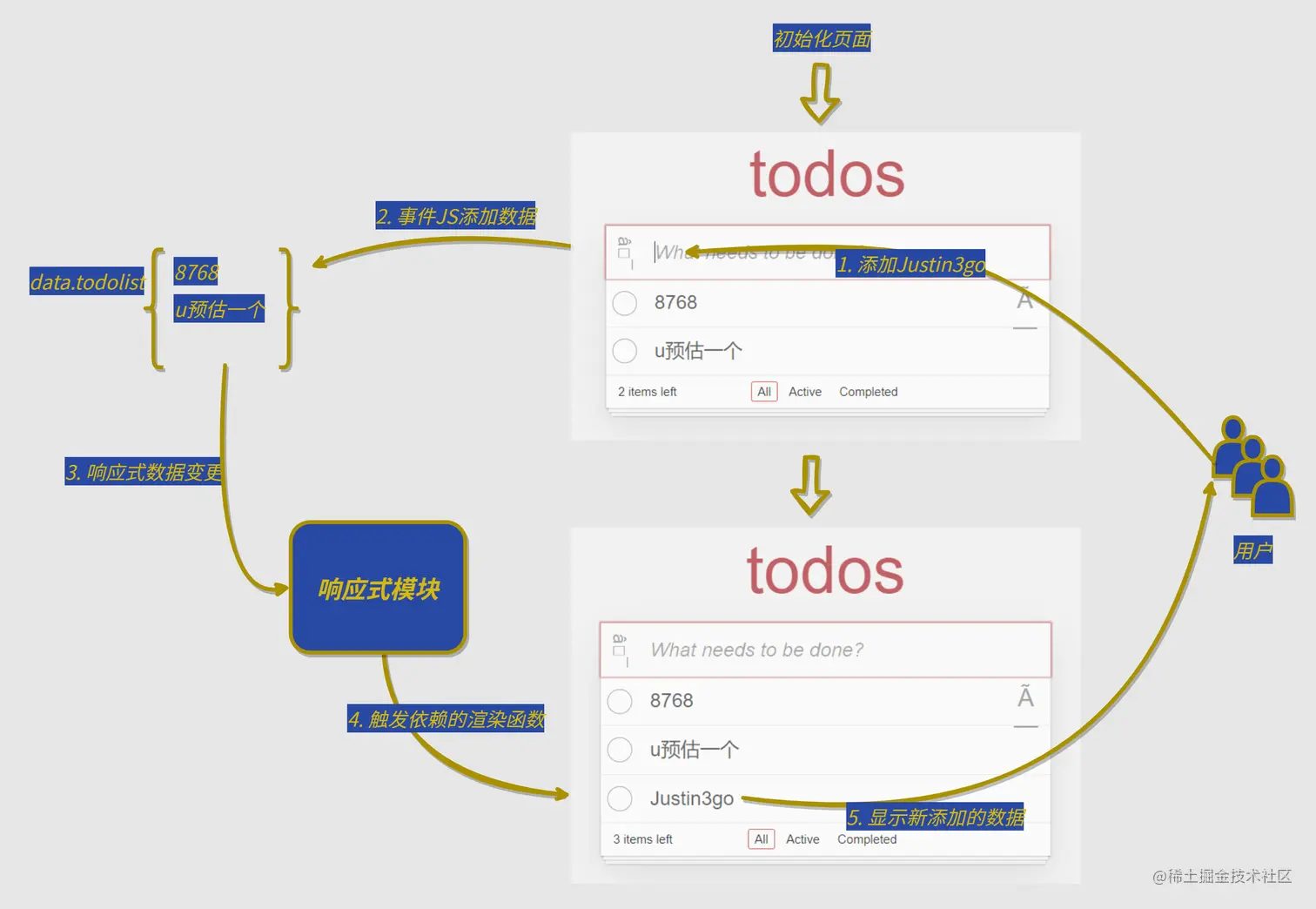 假设我们有一个todoList应用,其中的所有事项我们设置为响应式数据,当用户增删改事项时,我们作为开发者只需修改对应数据就可以了,至于后续页面事项列表的重新渲染是通过响应式模块自动触发的,这也是我们为什么要使用框架的原因之一。