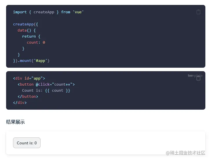 把框架理解为一个封装好的函数,所以首先需要确认函数的输入以及函数的返回。在这里,用户(开发者)的输入就是单文件组件,输出就是带有一些优秀特性的可运行的代码、用户预期的结果,比如上述这个count例子的结果展示。