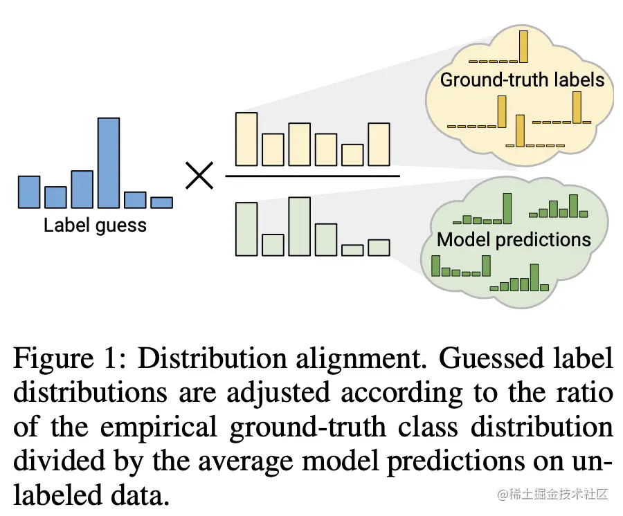 - Distribution Alignment。考虑到猜测无标签数据的label有可能存在噪声,因此考虑到使用有标签数据的标签分布,对无标签的猜测进行对齐。对应代码中的第7行。如下图所示,对应Label guess。是一个运行平均版本的无标签猜测,是有标签数据的标签分布。对齐之后的标签猜测如下公式