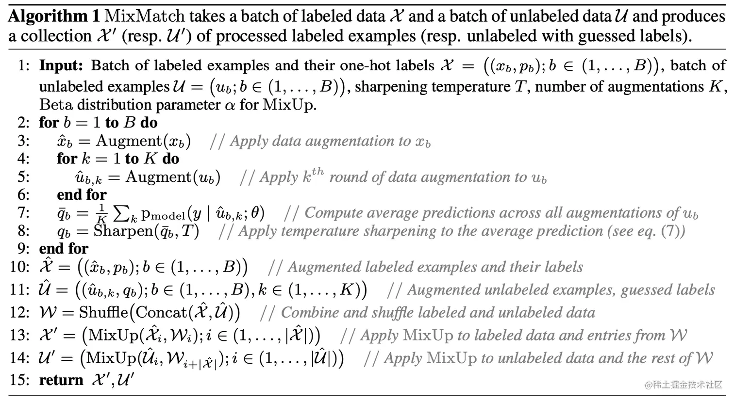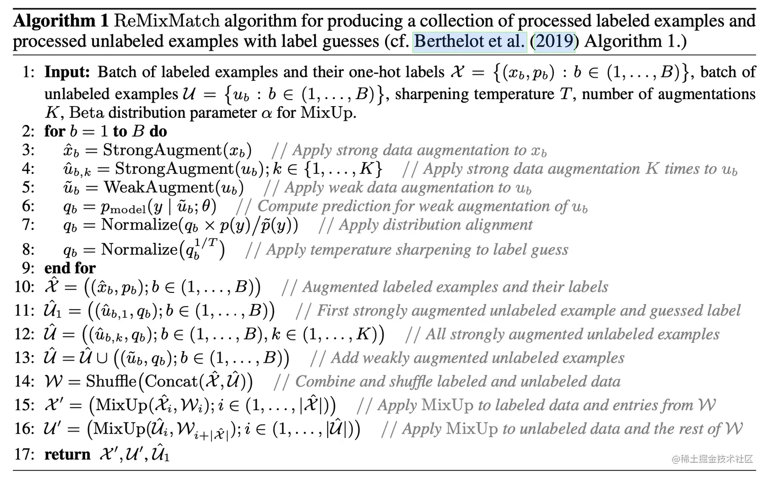 ReMixMatch的改进主要包含两部分: Distribution Alignment和Augmentation Anchor。伪代码如下: