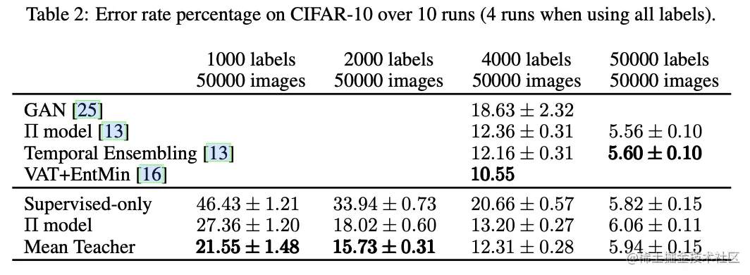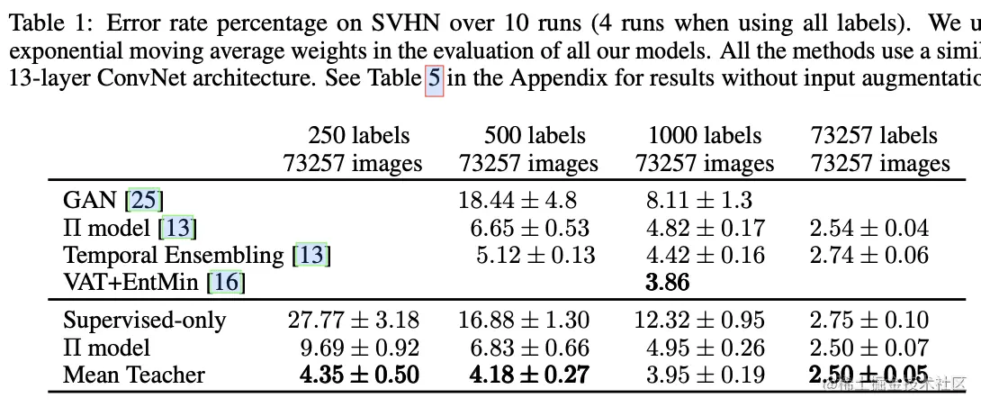 mean teache和之前的工作π model以及Temporal ensembling进行了对比