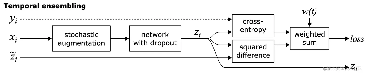 代码链接: github.com/ferretj/tem… Temporal ensembling的方法和π model非常相似,核心思想都是想利用好有监督的数据和无监督的数据,改进的原因是在π model中使用了两次模型增广和推理,耗时比较长,在Temporal ensembling中使用了Temporal的模型,具体而言是使用了之前epoch得到的特征结果去做对比,模型结构如下图: