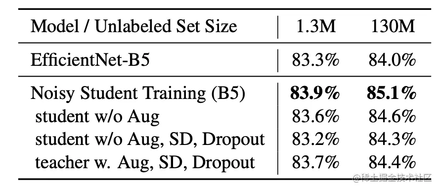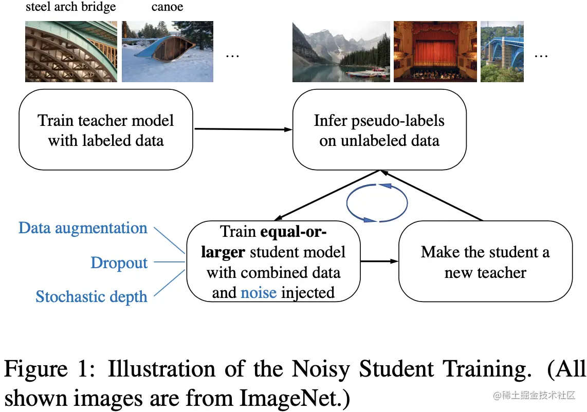 而Noisy Student强调的是在student模型中加入噪声,teacher模型和student模型可以用不同的模型训练,也可以使用相同的模型。要思考加入噪声的原因,可以假设teacher和student相同结构联合训练的场景,则student模型不加入噪声,则预测结果和通过teacher模型生成的伪标签会完全一致,student模型就失去了更新的动力。所以加入噪声是很有必要的。