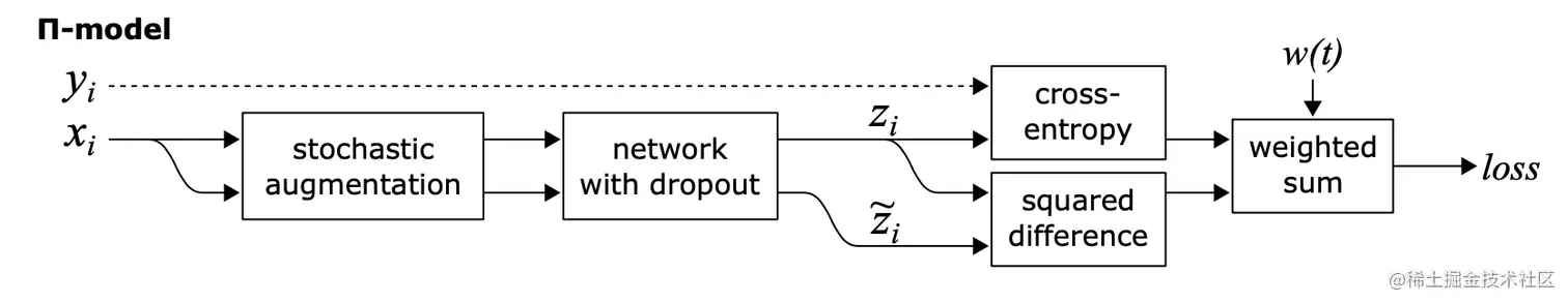 π model网络结构如下图所示。因为是半监督学习,既有有标签数据,也有无标签数据,π model将网络分为了两部分: