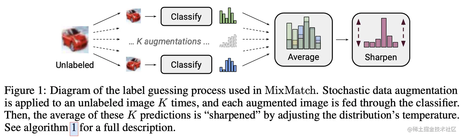 - 对无标签的数据增广后的结果模型推理后分类,对K个结果取平均,得到模型预测的标签