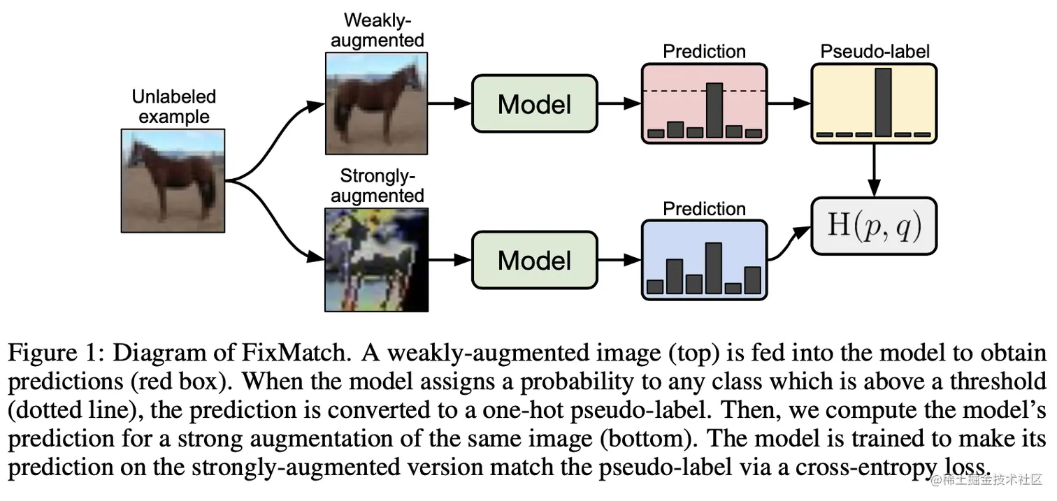 对于无标签的数据,会先经过弱数据增广获取伪标签,只有某一类的置信度大于一定的阈值才会执行为标签的生成(下图中红色部分),生成的伪标签用于监督强增广的输出值。