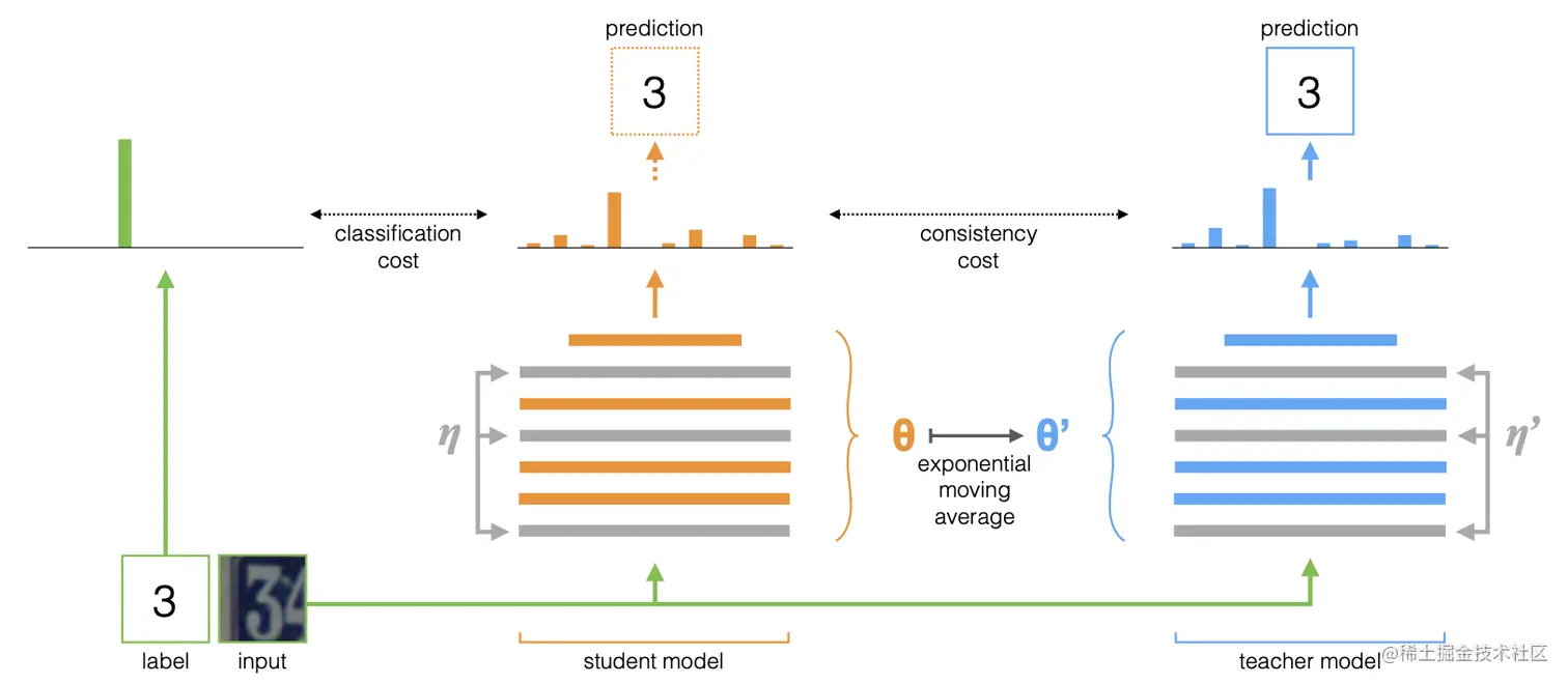 mean teacher的思想和Temporal ensembling也非常相似。改进的原因是在Temporal ensembling中每个epoch才会更新一次对比的特征,在大型的数据集上训练时,用于对比的特征更新的非常慢,时间成本也很高,因此在mean teacher中使用更新模型的方式取代原来更新特征的方式。思想如下图所示