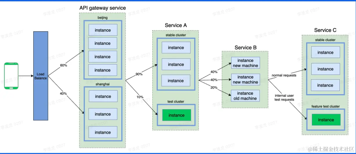 在微服务框架下,我们可以基于地区、集群、实例、请求等难度,对端到端流量的路由路径进行精确控制