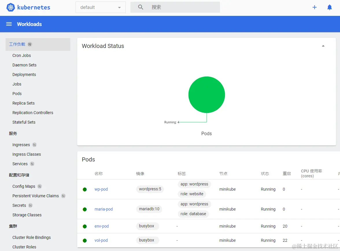 点击任意一个 Pod 的名字,就会进入管理界面,可以看到 Pod 的详细信息,而右上角有 4 个很重要的功能,分别可以查看日志、进入 Pod 内部、编辑 Pod 和删除 Pod,相当于执行 logs、exec、edit、delete 命令,但要比命令行要直观友好的多