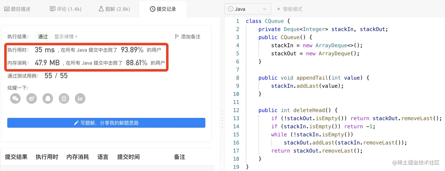 最后需要说明一下,就是在题解中,为了提升执行速度,我们没有采用Stack类,而是采用Deque(双向队列)类中的addLast(...)和removeLast()方法来模拟栈结构。