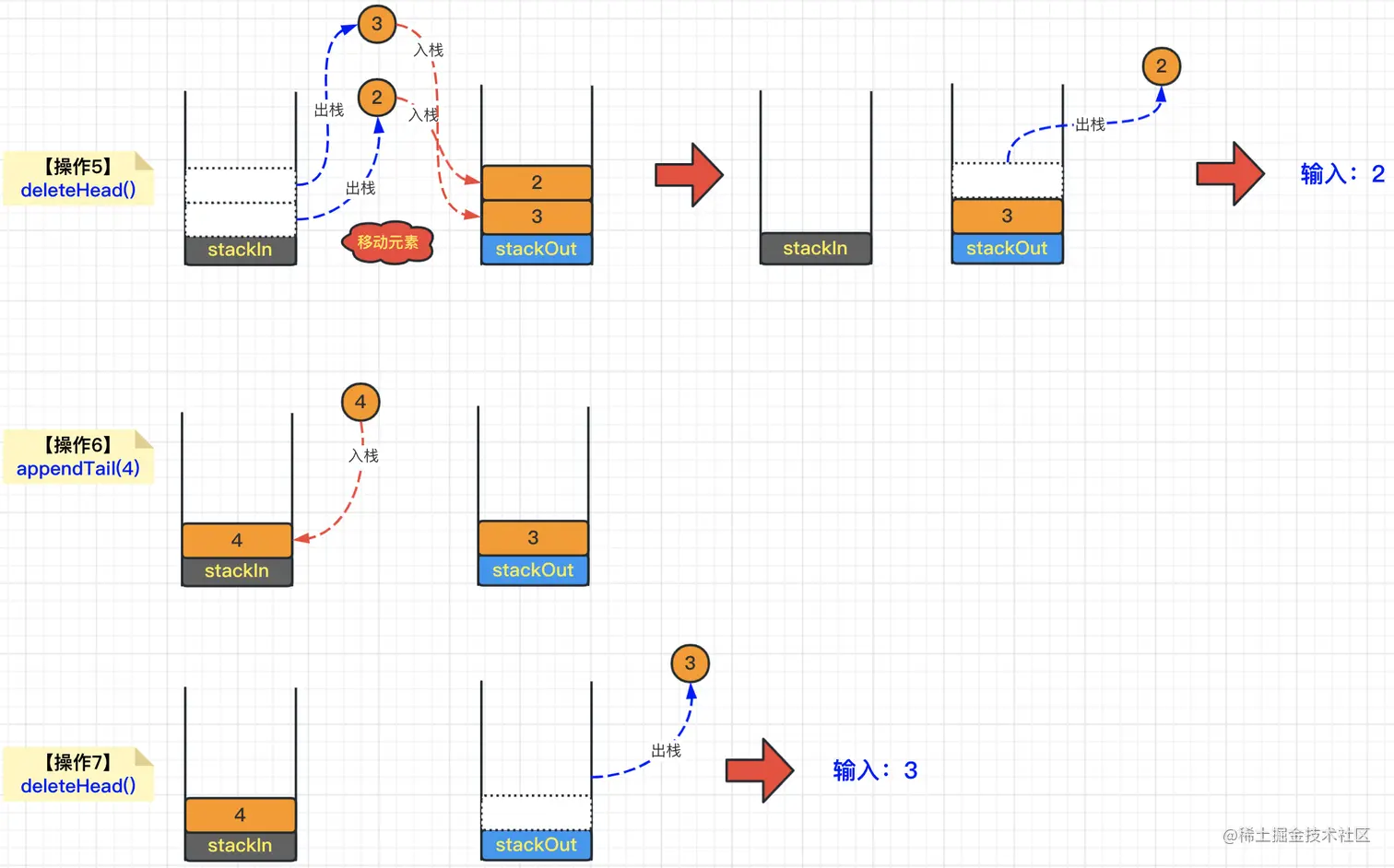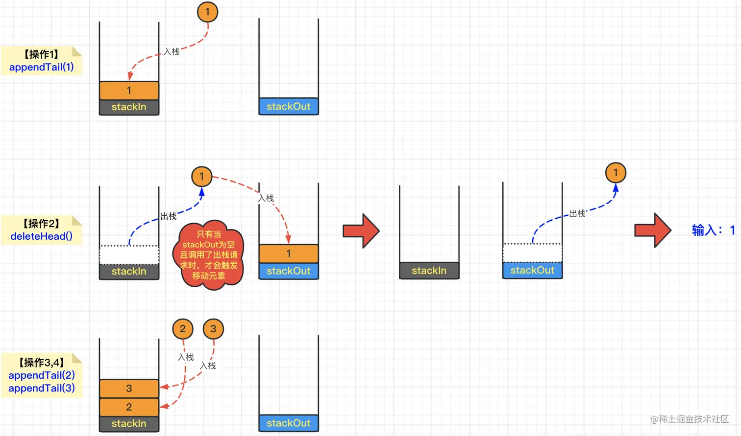 那么当添加元素的时候,只需要向栈stackIn添加即可;那么当调用获取元素的时候,我们只需要从stackOut中弹出栈顶元素即可。