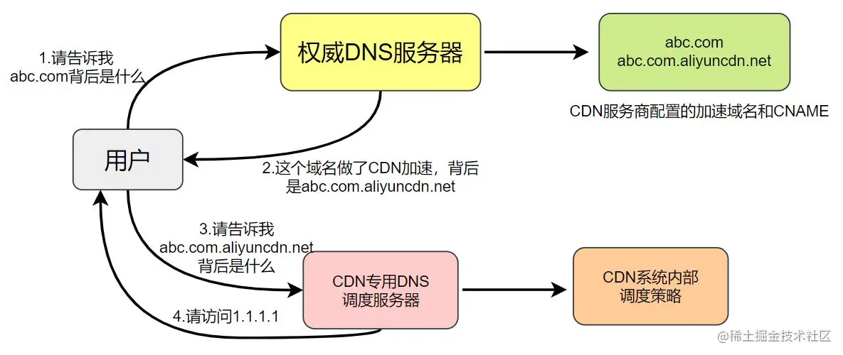 - 权威DNS服务器的请求转发,当用户访问abc.com时,传统的权威DNS服务器对abc.com进行解析时得到的是abc.com.aliyuncdn.net这个配置的CNAME,从而通过CNAME顺利将请求转到CDN服务商专用的DNS服务器,由该服务器返回CDN的资源节点。