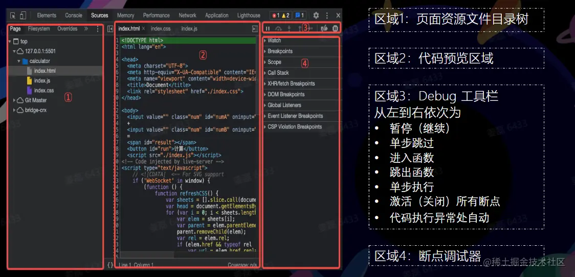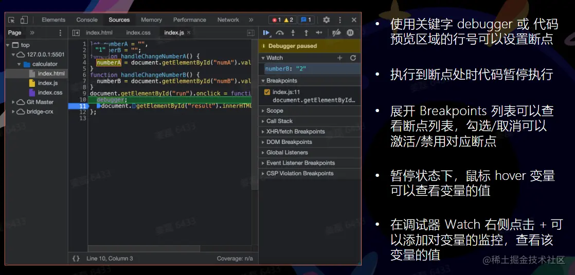 使用关键字 debugger 或 代码预览区域的行号可以设置断点