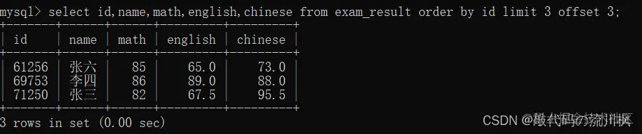 select id,name,math,english,chinese from exam_result order by id limit 3 offset 3;
