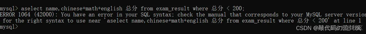 select name,chinese+math+english 总分 from exam_result where chinese + math + english < 200;