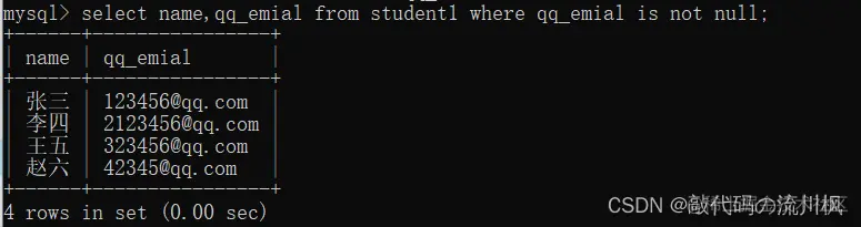 select name,qq_emial from student1 where qq_emial is not null;