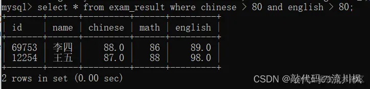 select * from exam_result where chinese > 80 and english > 80;
