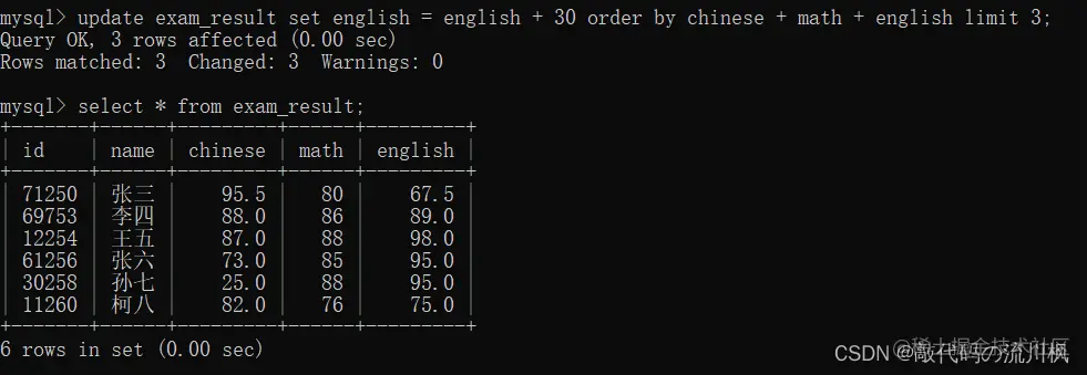 update exam_result set english = english + 30 order by chinese + math + english limit 3;
