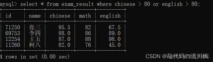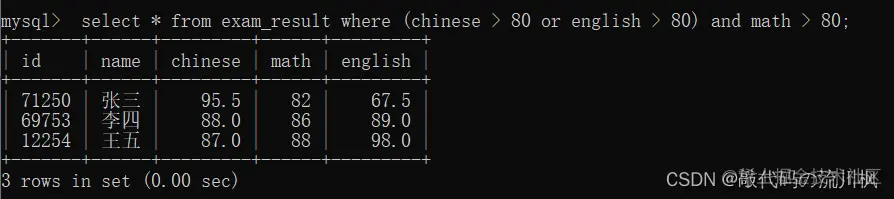 select * from exam_result where chinese > 80 or english > 80 and math > 80;