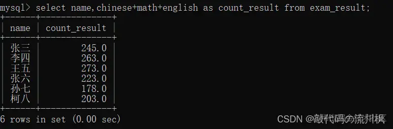 select name,chinese+math+english as count_result from exam_result;