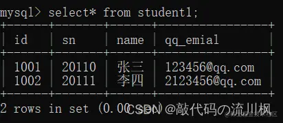 insert into student1 (id,sn,name,qq_emial) values