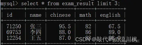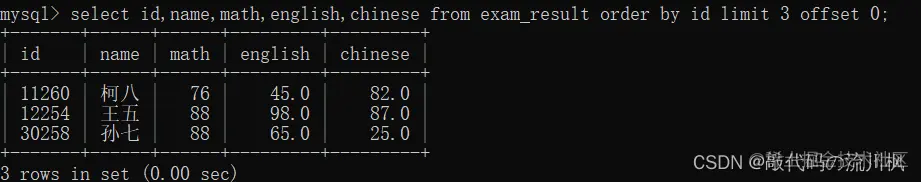 select id,name,math,english,chinese from exam_result order by id limit 3 offset 0;