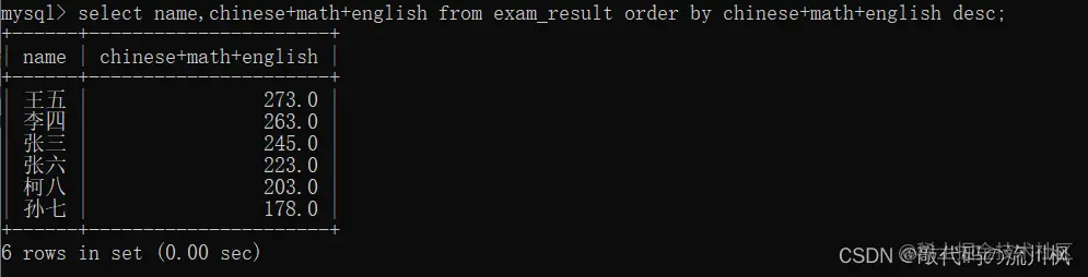 select name,chinese+math+english from exam_result order by chinese+math+english desc;