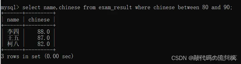 select name,chinese from exam_result where chinese between 80 and 90;