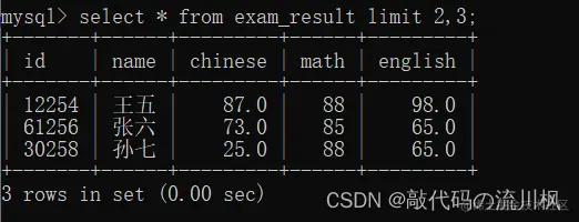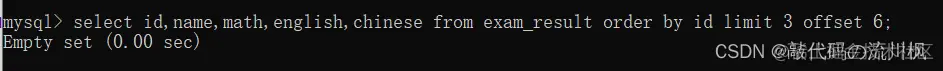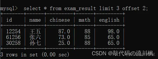 select id,name,math,english,chinese from exam_result order by id limit 3 offset 6;