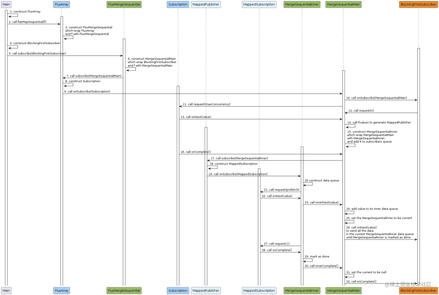 FluxMergeSequential.subscribe(BlockingFirstSubscriber)订阅FluxMergeSequential。 FluxMergeSequential创建MergeSequentialMain实例,它包含了BlockingFirstSubscriber和f。FluxMergeSequential调用FluxArray.subscribe(MergeSequentialMain)订阅FluxArray。FluxArray创建Subscription实例。FluxArray调用MergeSequentialMain.onSubscribe(Subscription)来通知MergeSequentialMain订阅成功。MergeSequentialMain调用BlockingFirstSubscriber.onSubscribe(MergeSequentialMain)来通知BlockingFirstSubscriber订阅成功,这里MergeSequentialMain既是一个Subscriber,也是一个Subscription。MergeSequentialMain调用Subscription.request(maxConcurrency)来请求数据,其大小为flatMapSequential允许的最大并行数。该调用不需要等待BlockingFirstSubscriber调用MergeSequentialMain.request(n),因为MergeSequentialMain需要先将Subscription发送的数据转换为新的Publisher,然后才能将新的Publisher数据发给BlockingFirstSubscriber,所以转换过程可以提前发生。BlockingFirstSubscriber调用MergeSequentialMain.request(n)来请求固定大小的数据,该调用可发生多次。Subscription调用MergeSequentialMain.onNext(value)来向MergeSequentialMain发布数据,该调用可发生多次。MergeSequentialMain调用f(value)来对数据进行转换,生成新的Publisher,这里我们将其命名为MappedPublisher。MergeSequentialMain生成一个MergeSequentialInner,并将其加入到subscribers数组中。- 在数据发布结束时,