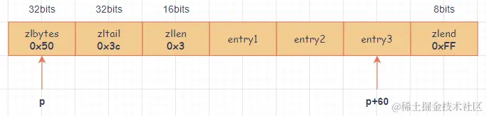 举个例子,压缩列表 zlbytes 值为 0x50 (十进制是 80),表示该压缩列表占用 80 字节;zltail 值为 0x3c (十进制是 60),表示如果有一个指向压缩列表起始地址的指针 p,那么只要用指针 p 加上偏移量 60,就可以计算出表尾节点 entry3 的地址;zllen 值为 0x3 (十进制是 3),表示压缩列表有三个节点。
