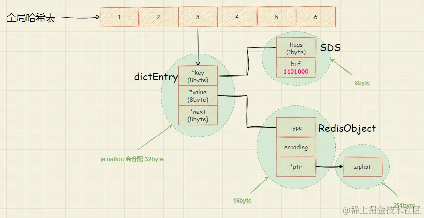 结合全局哈希表,内存各部分占用如下: