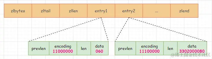 - prevlen,表示前一个 entry 的长度。prev_len 有两种取值情况:1 字节或 5 字节。如果上一个 entry 的长度小于 254 字节,取值 1 字节;否则,就取值为 5 字节;