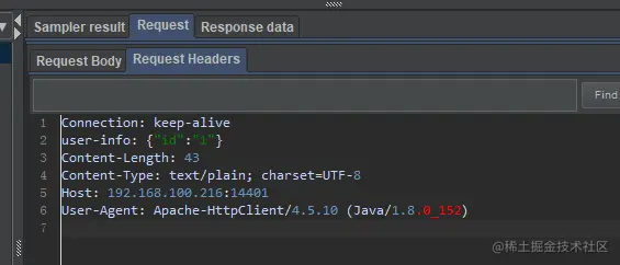 在HTTP Header Manager中可以配置Headers Stored in the Header Manager信息,这里是设置了一个自定义参数“user-info”并设置值为{"id":"1"}。在执行之后可以看到Request Headers的传参结果,如下图: