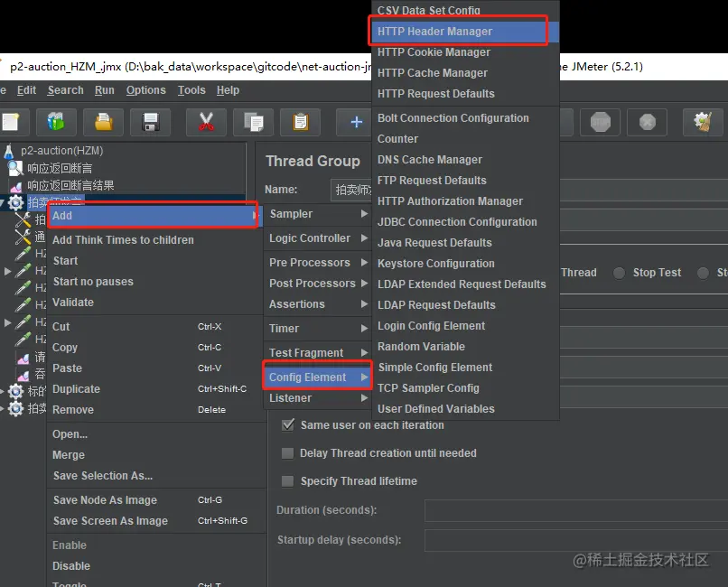 如果需要在Jmeter中发送带Http Header信息的数据时,可以在线程组中新增一个配置元素,如下图:
