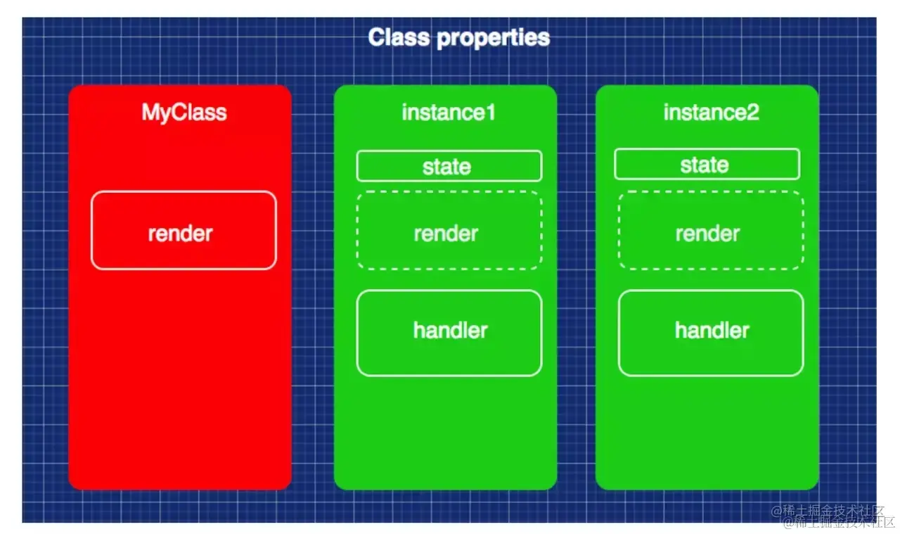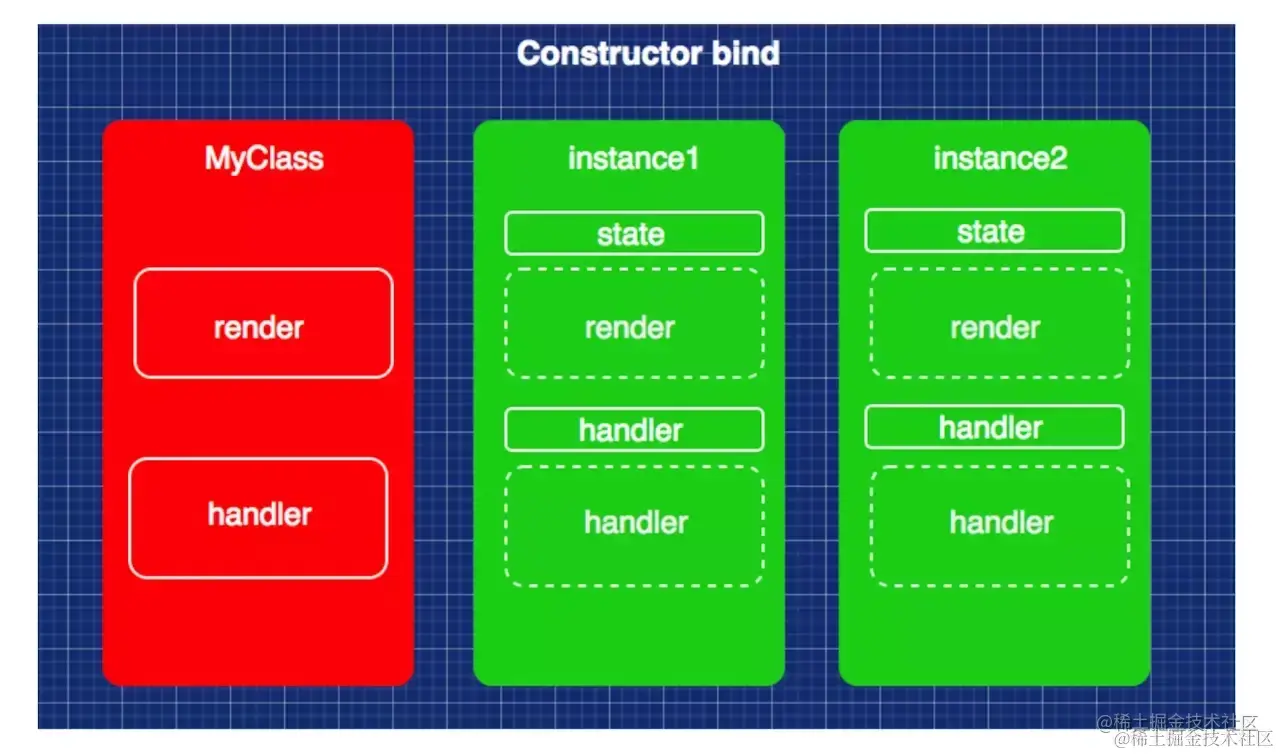 注: 图中,虚线框面积代表引用函数所节省的内存,实线框的面积代表消耗的内存。 图一:使用箭头函数做this绑定。只有render函数定义在原型对象上,由所有实例对象共享。其他内存消耗都是基于每个实例上的。 图二:在构造函数中做this绑定。render,handler都定义在原型对象上,实例上的handler实线框代表使用bind生成的函数所消耗的内存大小。