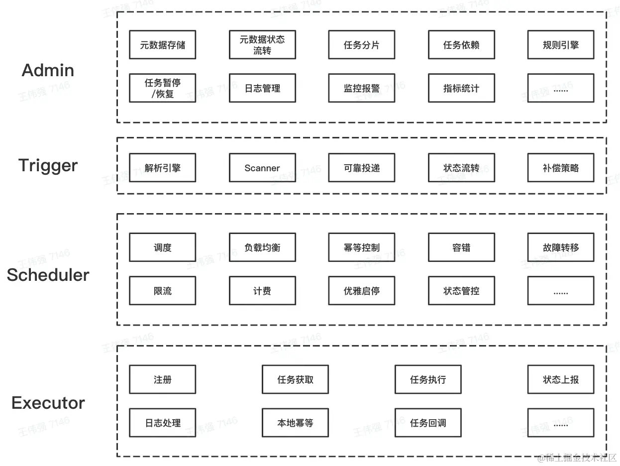 - 业内流行框架| | Xxl-job | SchedulerX | TCT | Elastic-job | Saturn | | ---------- | ---------- | ---------- | ---- | ----------- | ------ | | 来源公司 | 美团点评 | 阿里巴巴 | 腾讯 | 当当网 | 唯品会 | | 是否开源 | 是 | 否 | 否 | 是 | 是 | | 任务编排 | 子任务依赖 | 支持 | 支持 | 不支持 | 不支持 | | 任务分片 | 支持 | 支持 | 支持 | 支持 | 支持 | | 高可用 | 支持 | 支持 | 支持 | 支持 | 支持 | | 故障转移 | 支持 | 支持 | 支持 | 支持 | 支持 | | 可视化运维 | 支持 | 支持 | 支持 | 支持 | 支持 |