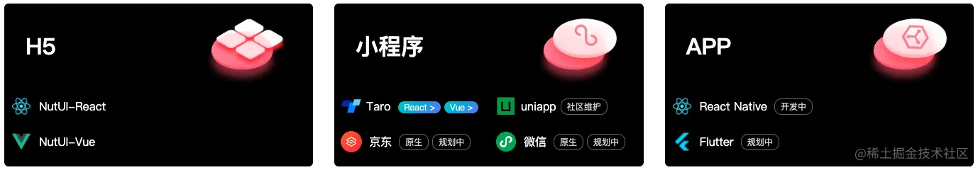 NutUI 作为移动端组件库,4.0 开始会分为 基础组件 与 高级组件 两个方向。针对基础组件,开发方向拆分为 H5、小程序、APP,丰富更多的 “端” 需求。