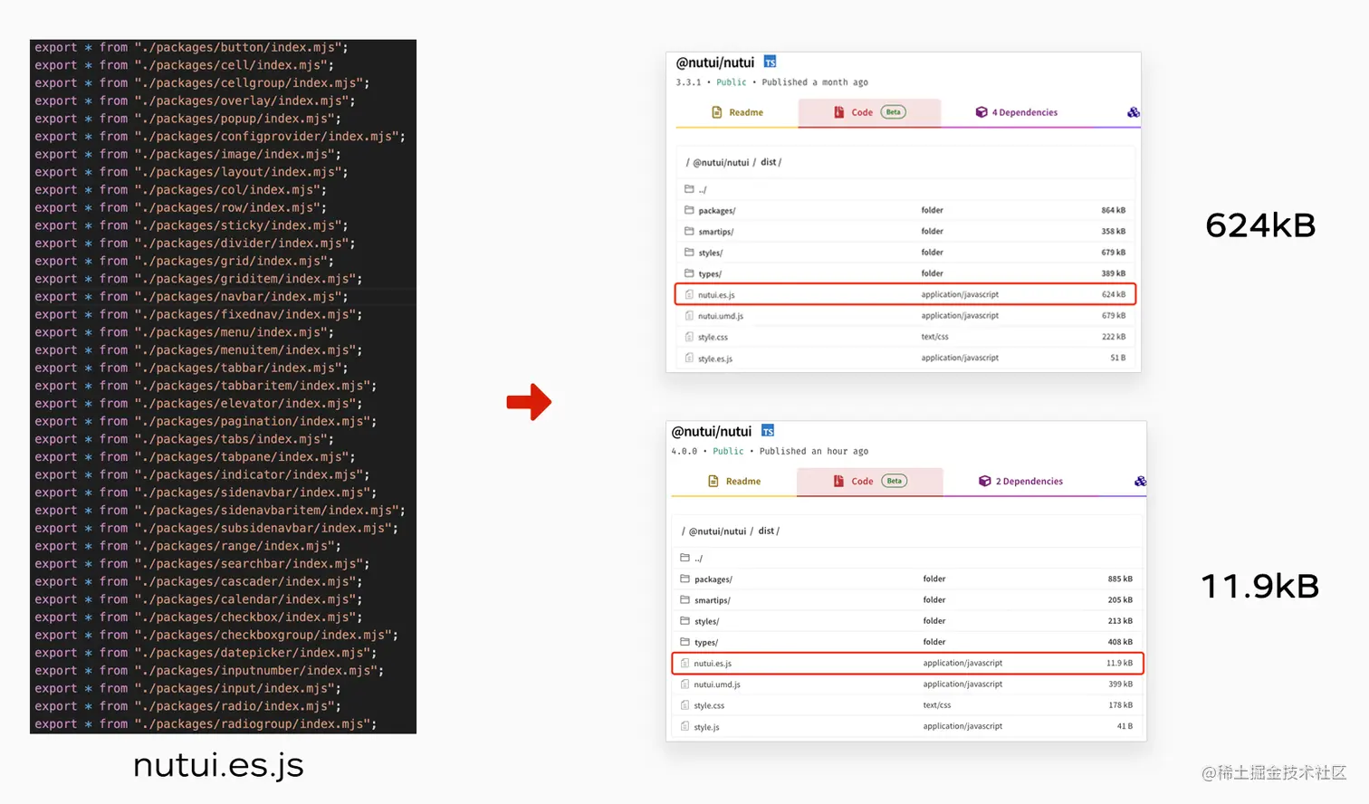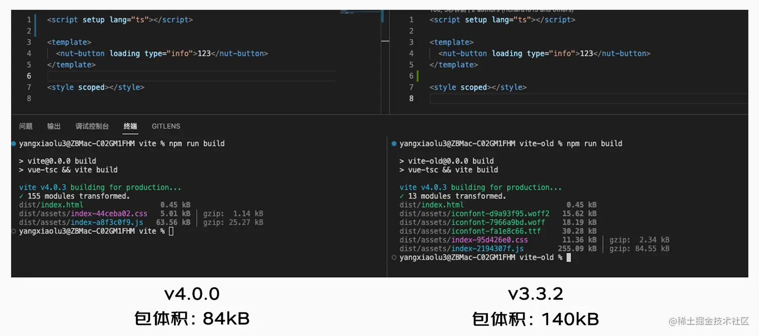 NutUI 4.0 优化打包策略,nutui.es.js 由全量引入改为按需加载,其文件体积由 624kB 下降至 11.9kB,减少 612kB。同时,避免了副作用的产生。
