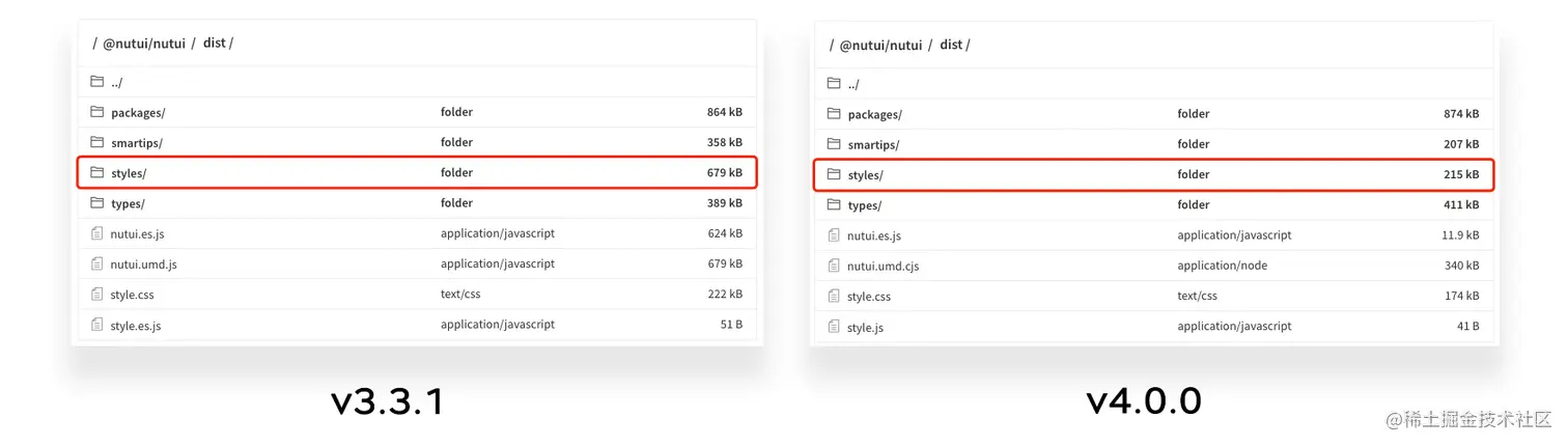NutUI 4.0 在包体积上也有了明显的下降,由 3.81MB 下降至 2.3MB,减少 39%。