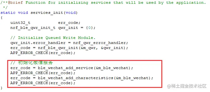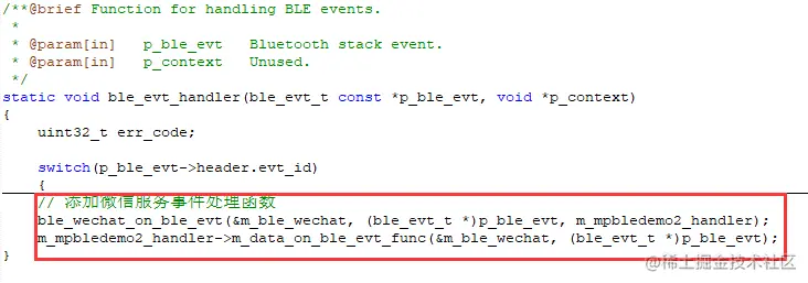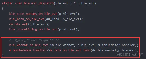 - 修改蓝牙事件处理函数 ble_evt_dispatch() 或 ble_evt_handler() 在最后添加微信服务事件处理函数