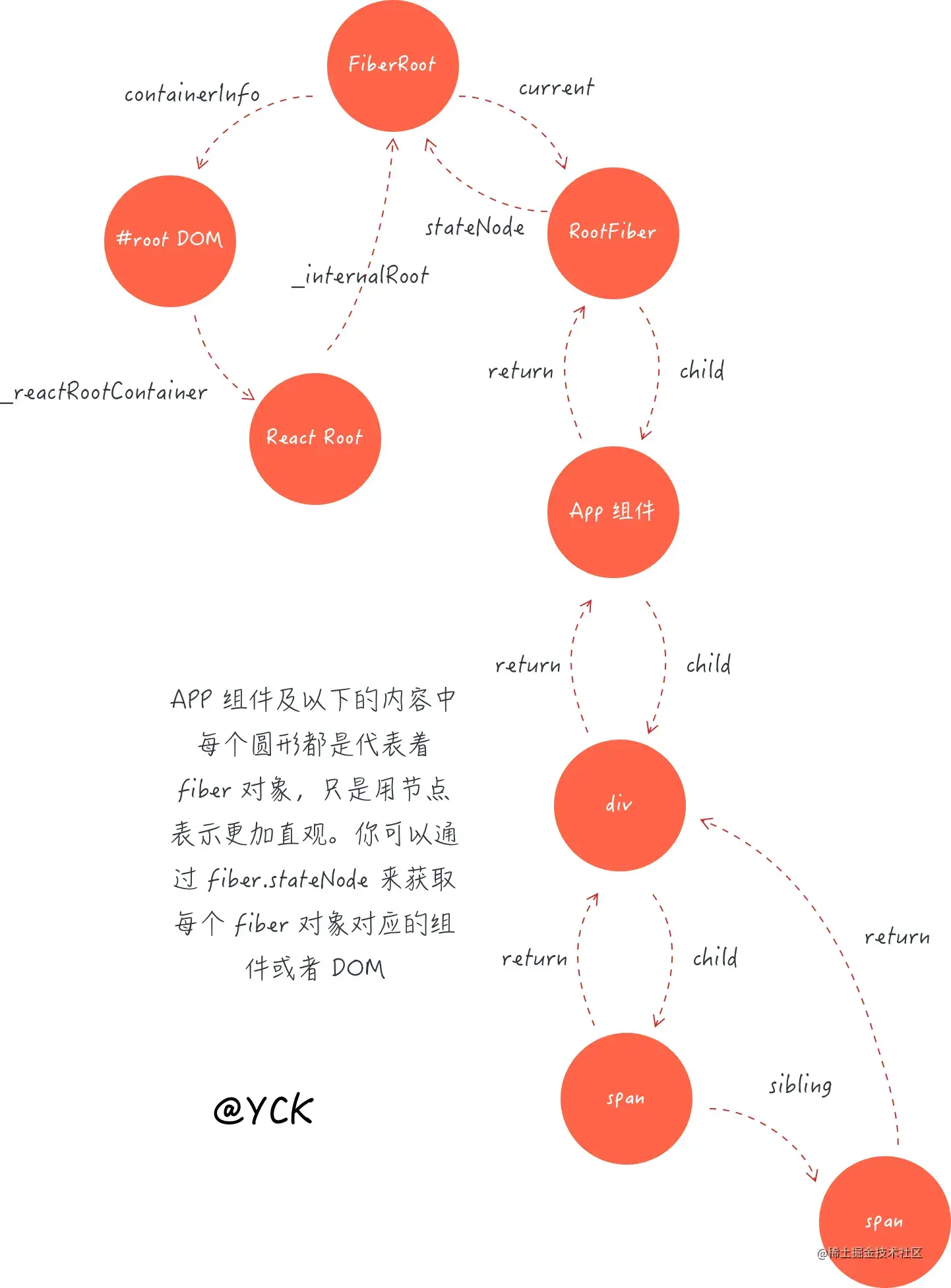 return、child、sibling 这三个属性很重要,它们是构成 fiber 树的主体数据结构。fiber 树其实是一个单链表树结构,return 及 child 分别对应着树的父子节点,并且父节点只有一个 child 指向它的第一个子节点,即便是父节点有好多个子节点。那么多个子节点如何连接起来呢?答案是 sibling,每个子节点都有一个 sibling 属性指向着下一个子节点,都有一个 return 属性指向着父节点。这么说可能有点绕,我们通过图来了解一下这个 fiber 树的结构。