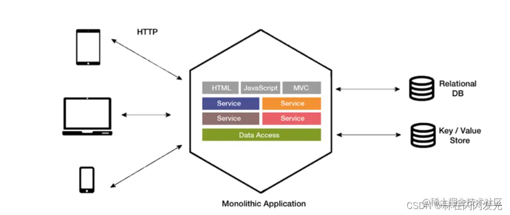 单体架构在小微企业比较常见,典型代表就是一个应用、一个数据库、一个web容器就可以跑起来。