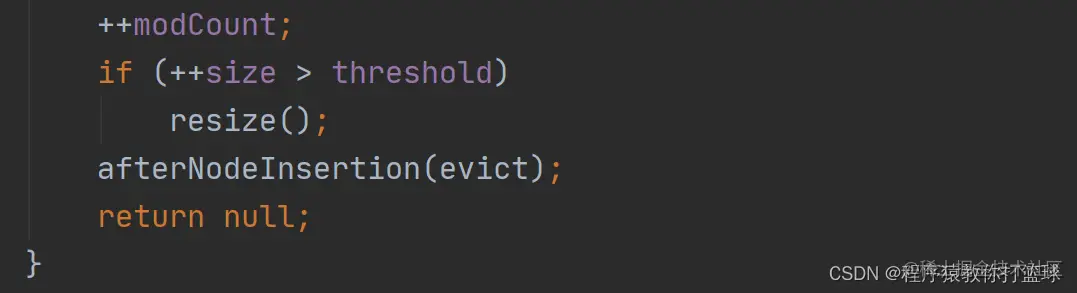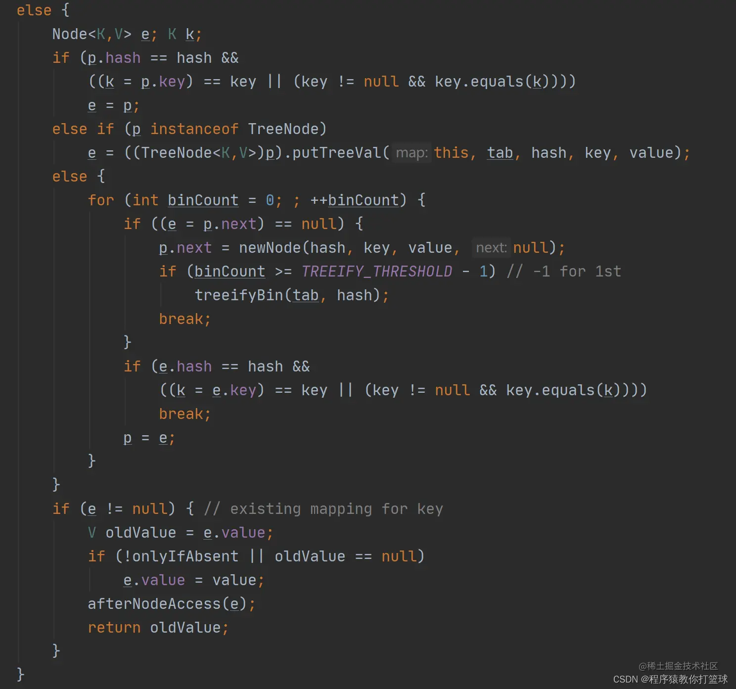 上面的 else 走完后,如果存在添加相同的元素的时候,e 则不为 null,只需要将待添加元素的 value 值赋值给原本存在元素的 value 值即可,也就是更新一下元素的 value 值。afterNodeAccess 方法不用管,是使用 LinkedHashMap 实现的一个操作,这里并没有使用。