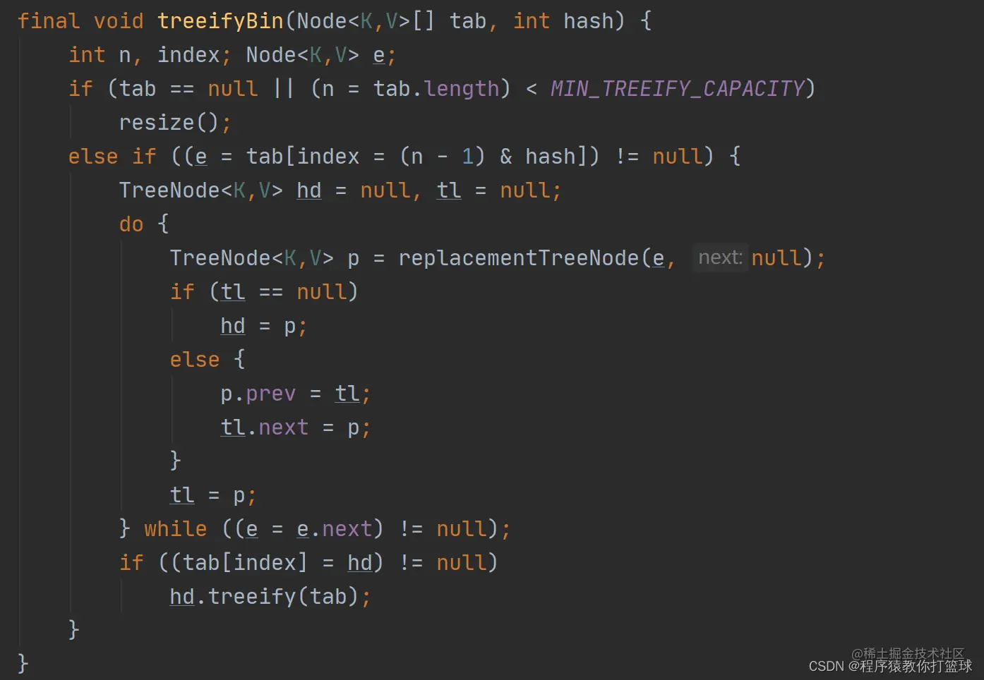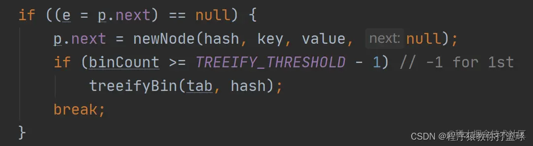树化的前提是,链表的长度大于等于 8,就会树化,因为是从 binCount 是从 0 开始的,所以 TREEIFY_THRESHOLD - 1。那么链表的长度大于等于 8,一定会从链表变成红黑树吗?我们往后看: