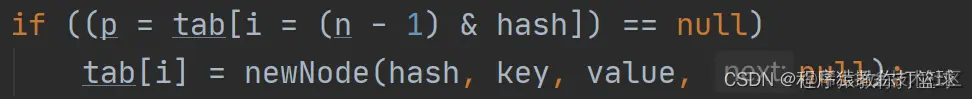 这里作用是通过 hash 值得到索引 i,也就是数组的下标,判断这个位置是否有元素了,如果没有则直接 new 一个节点放到该处。反之走 else 就表示该数组下标已经有元素了。
