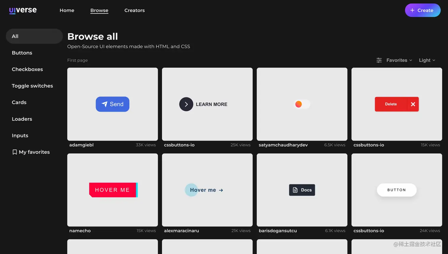 这个网站有很多有趣的网页小元素,都是用 HTML 和 CSS 写的。免费供给个人和商业使用,可以给你的项目增加一些有趣的元素。