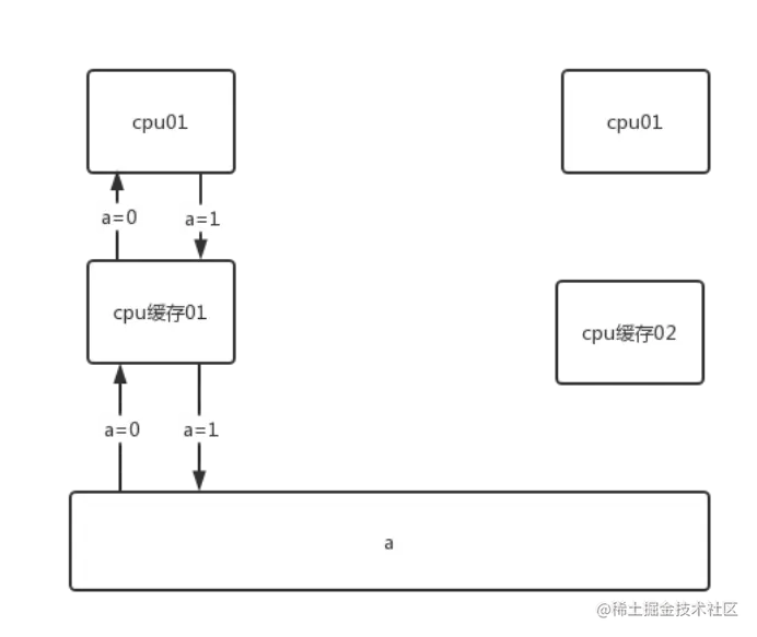当CPU 01将数据修改完后,CPU缓存01还没有将数据传给内存,CPU缓存02读到了a,此时a的值为0。