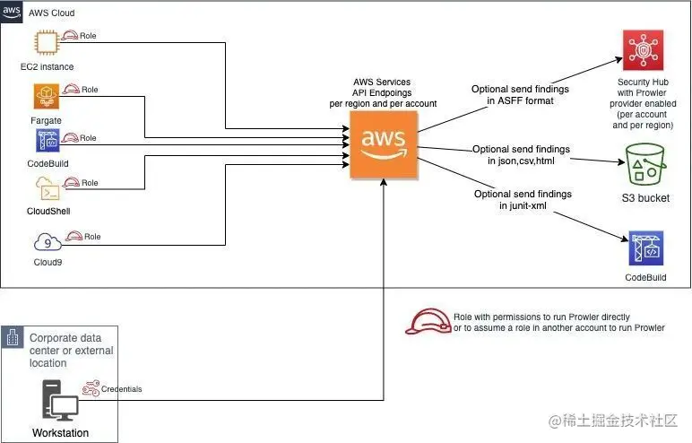 您可以从您的工作站、EC2 实例、Fargate 或任何其他容器、Codebuild、CloudShell 和 Cloud9 运行 Prowler。